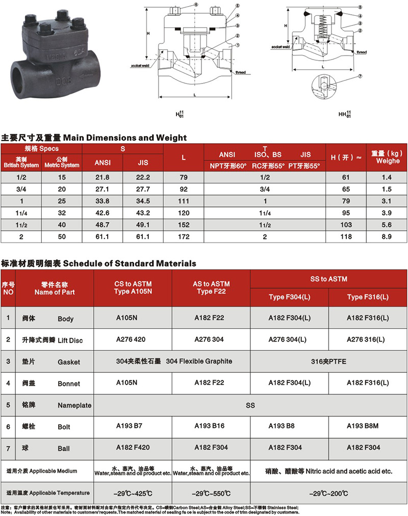 鍛鋼內螺紋承插焊升降式止回閥